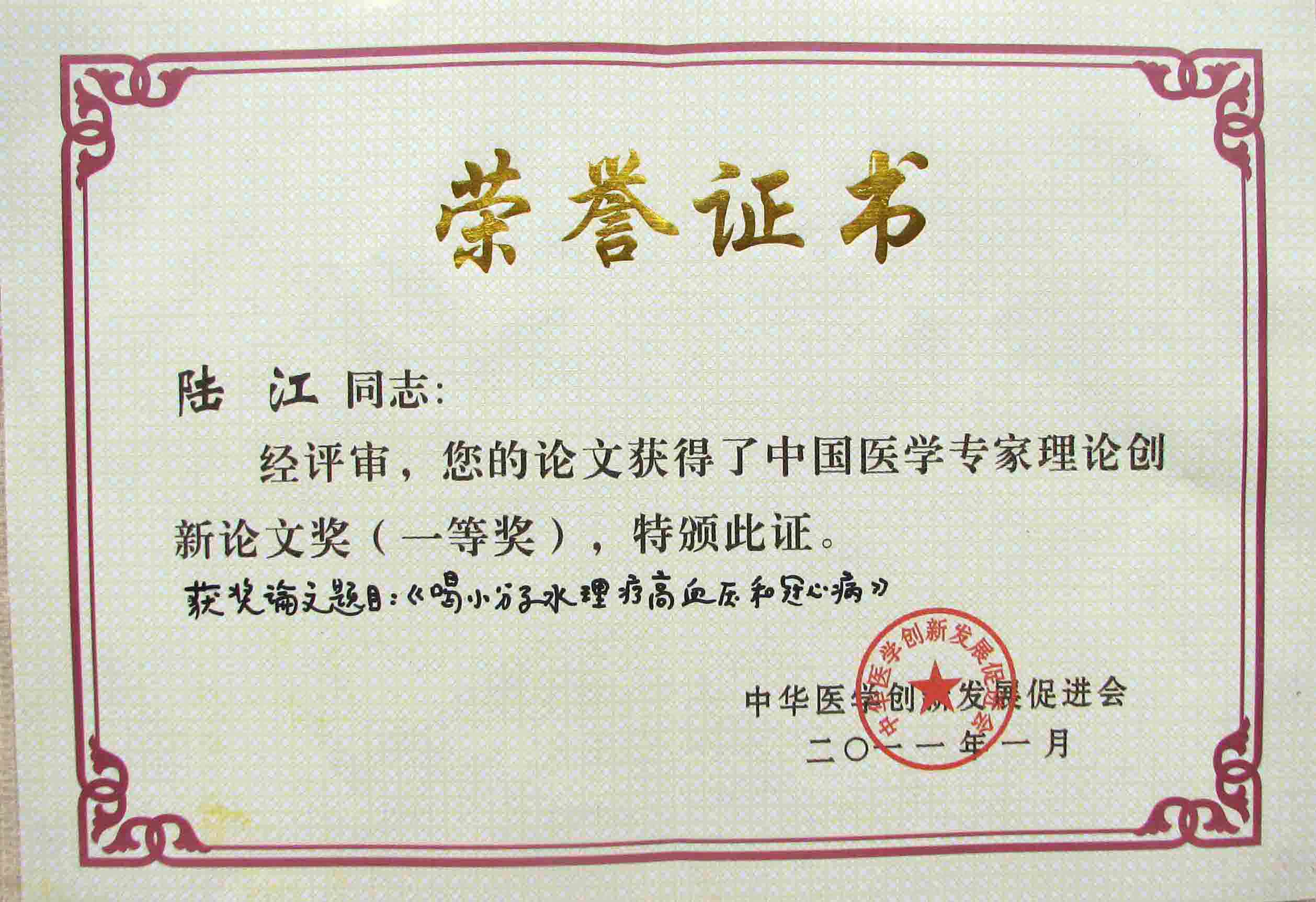 一.發明的亮點是中國基礎醫學研究成果的轉化醫學應用------------------------------------------------------------------------------------ 1990年春,我50歲,發現患了高血壓,便及時遵醫囑服藥。我想起父輩、祖輩曾患高血壓,后來都患中風癱瘓或心梗過世,所以心中壓力大。我夢想能根治高血壓,便研究醫學。當我檢索到中國基礎醫學研究成果,采用高脂餐和磁處理小分子團水飼喂小白鼠或大白免等兩組哺乳動物,經過2、4、6個月剖殺血檢,發現飼喂小分子團水的試驗組動脈內壁干凈,能減輕和延緩動脈粥樣硬化。我從這些研究成果受到啟發。覺得有責任研制出優良的器具,讓天下人能真正治愈高血壓,消除動脈粥樣硬化,延年益壽。于是,1990年我做成樣品,先后與愛人飲用兩三個月,分別治愈了高、低血壓,之后我們的血壓都正常,癥狀消失。該水經南京大學做核磁共振檢測為55.82赫茲的微小分子團水。該品經工業開發后,1994年送給廣西三家三甲醫院做臨床試用4個月,再經北京和廣西醫學專家鑒定認為:“降脂降壓效果好” ,“能擴大心腦動脈流量,改善心腦電圖和微循環” ,“對治療心腦動脈粥樣硬化、高血壓、高血脂有良好的醫療保健作用”。1996年產品獲得中國發明專利權。這就使產品可以轉化為醫學應用,人類可逐漸改變終生服藥,自己祛除病癥